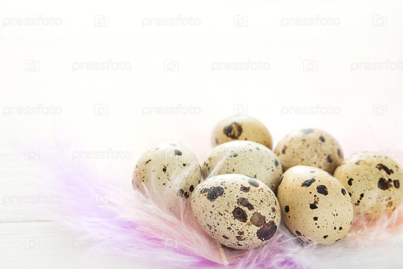 Пятнистые перепелиные яйца на деревянном столе в гнезде из нежных перьев пастельных тонов. Фон пасхальной деревни, натуральные экологически чистые продукты. Копировать пространство