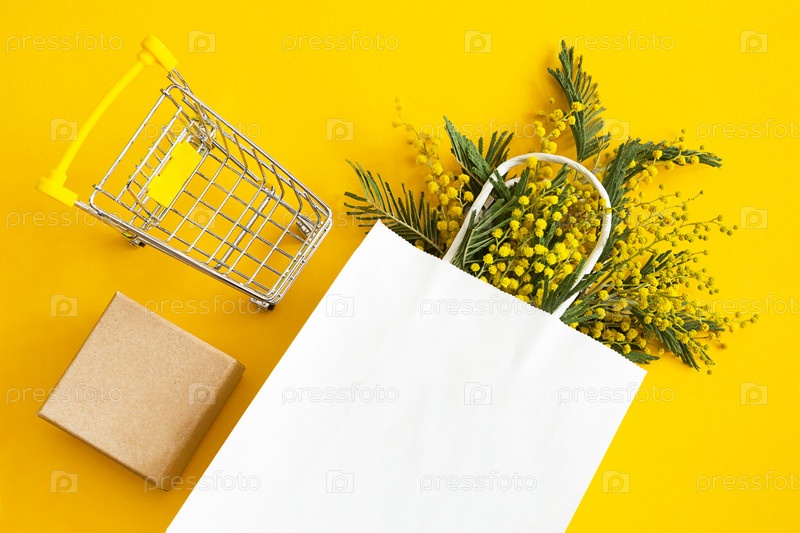 Букет мимоз в белом бумажном пакете, ремесленная подарочная коробка и корзина с продуктами.Весенние покупки, подарки и акции к Международному женскому дню.Желтый фон, copyspace, flatlay