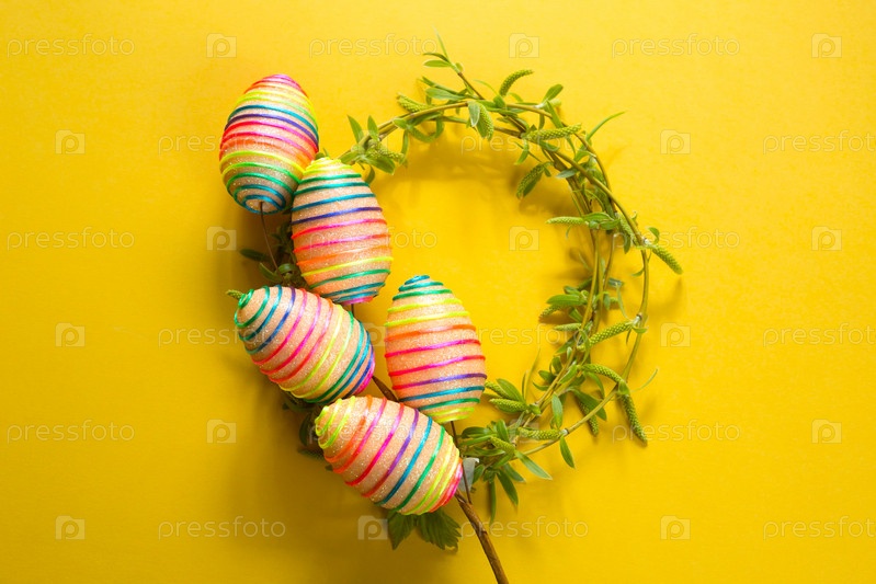 Венок из молодых весенних листьев на ветвях с красочными пасхальными яйцами. Гнездо с яйцами на желтом фоне