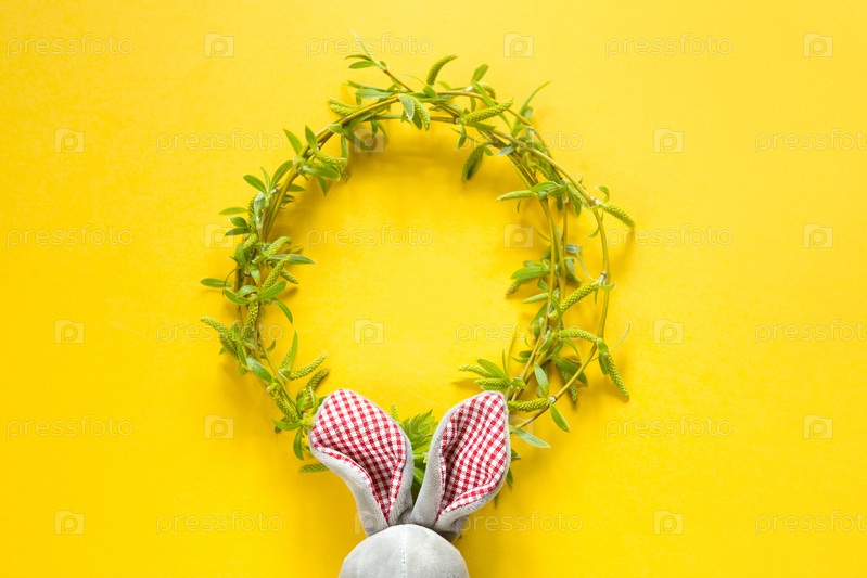 Венок из молодых весенних листьев на ветвях с ушами пасхального кролика в красной клетке на желтом фоне. Копировать пространство