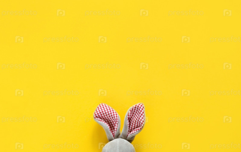 Уши пасхального кролика на желтом фоне с копирайтом. Минимализм, заяц, праздник Пасхи