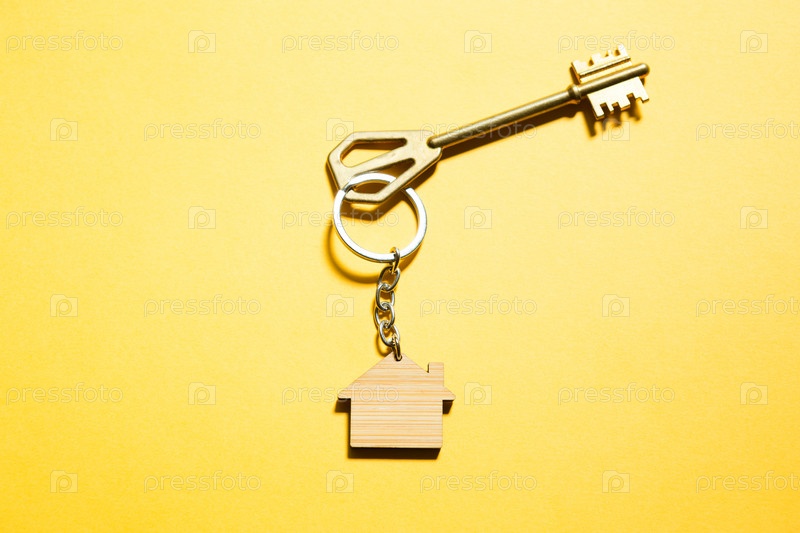 Брелок в виде деревянного дома с ключом на желтом фоне. Строительство, дизайн, проект, переезд в новый дом, ипотека, аренда и покупка недвижимости. Копировать пространство