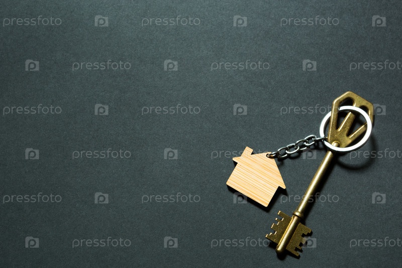 Брелок в форме дома с ключом на черном фоне. Строительство, дизайн, проект, переезд в новый дом, ипотека, залог, аренда и покупка недвижимости. Копировать пространство