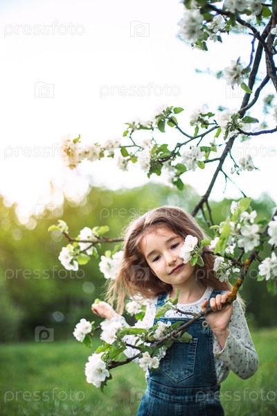Милая маленькая девочка 5 лет в цветущем саду белой яблони весной. Весна, фруктовый сад, цветение, аллергия, весенний аромат, нежность, забота о природе. Портрет