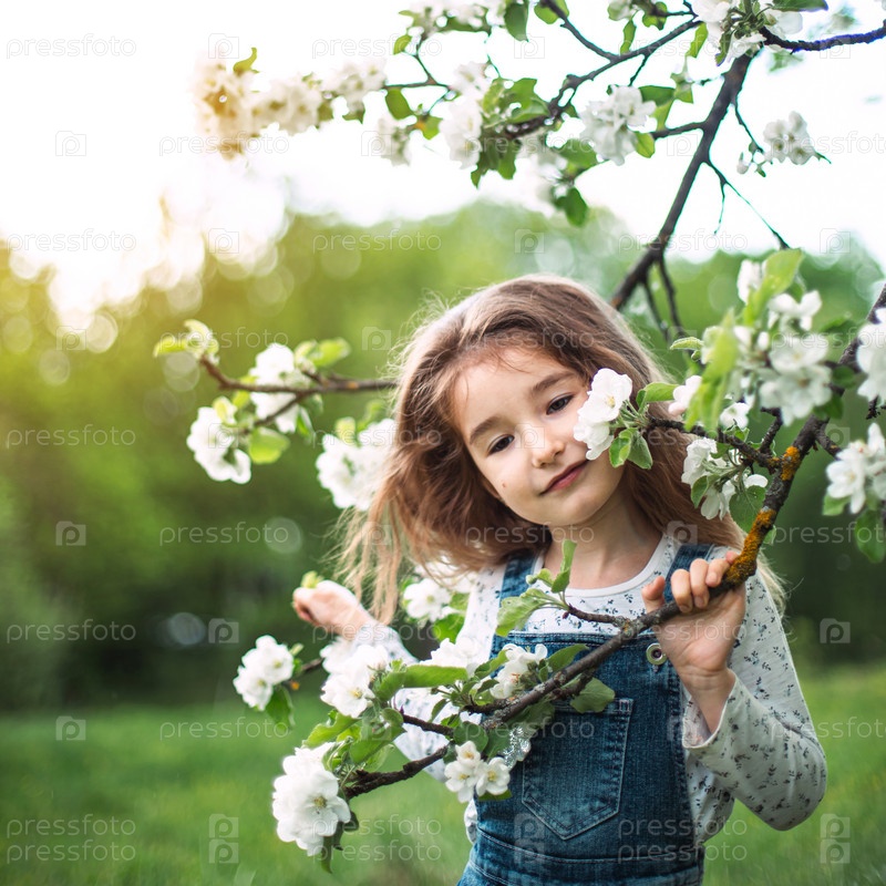 Милая маленькая девочка 5 лет в цветущем саду белой яблони весной. Весна, фруктовый сад, цветение, аллергия, весенний аромат, нежность, забота о природе. Портрет
