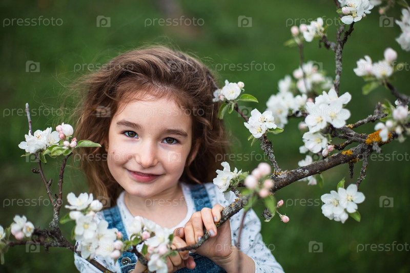 Милая маленькая девочка 5 лет в цветущем саду белой яблони весной. Весна, фруктовый сад, цветение, аллергия, весенний аромат, нежность, забота о природе. Портрет