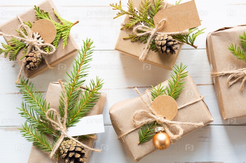 Подарочная коробка к Рождеству и Новому году из экологически чистых материалов: крафт-бумага, живые еловые ветки, шишки, шпагат. Теги с макетом, натуральный декор, ручная работа, сделай сам. Плоско, фон, рамка, Минимализм