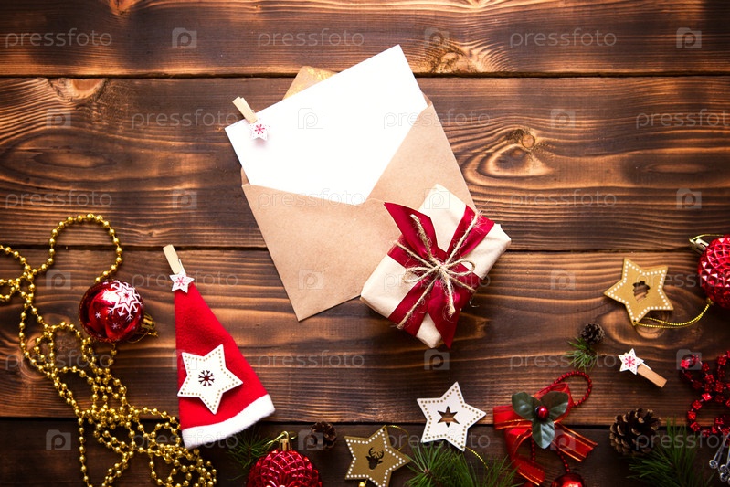 Почтовый конверт из крафт-бумаги с белым листом для текста на деревянном фоне с рождественским декором. Письмо Деду Морозу, список желаний, новогодняя мечта, подарок. Плоская планировка, пространство для копирования