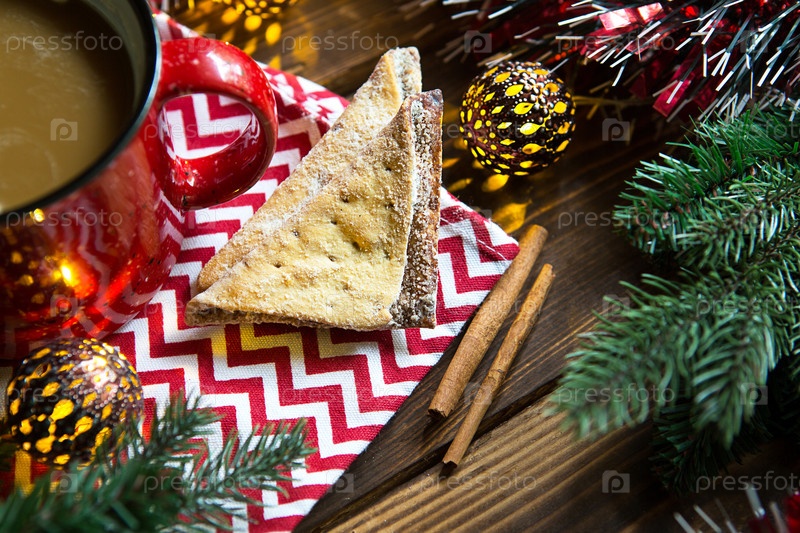 Треугольное печенье с сахарной пудрой и корицей на салфетке с зигзагообразным узором в рождественском декоре. Красная кофейная кружка с зефиром, еловыми ветками, гирляндой, новым годом, комфортом