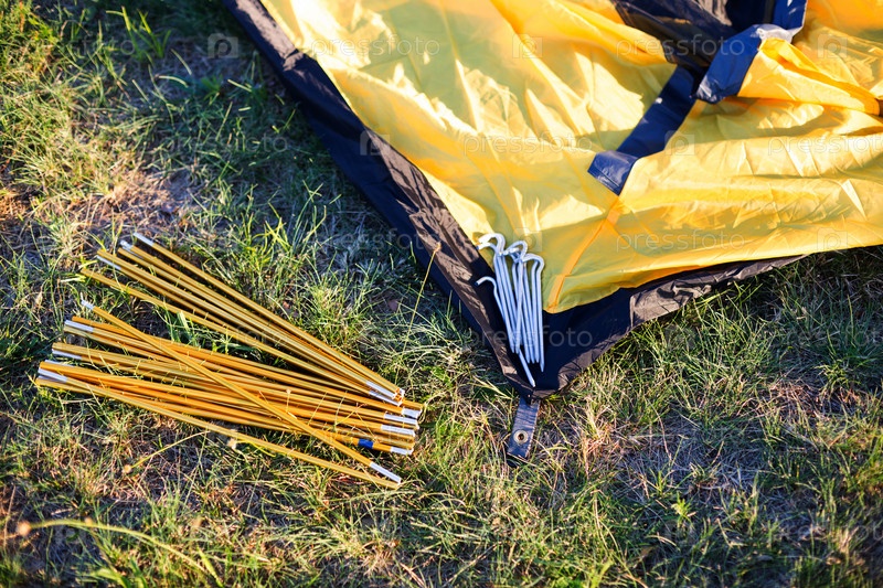Алюминиевые монтажные дуги, колышки для установки туристической желтой палатки и непромокаемой ткани на грунт. Легкое снаряжение для туризма. Активный отдых, инструкции по сборке, внутренний экотуризм