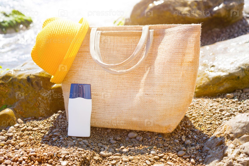 Пляжная сумка с белым тюбиком солнцезащитного крема на галечном пляже у моря. Путешествия, пляжный отдых на курорте, очки, желтая шляпа. Защита кожи от УФ-лучей, масло для загара. Скопируйте пространство, макет