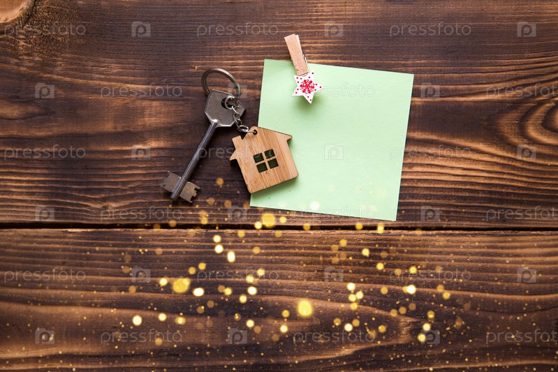 Ключ от дома с брелком в виде коттеджа на деревянном фоне на листах с рождественским декором. Исполнение мечты, Новый год, трансфер, доли ипотеки, аренда коттеджа