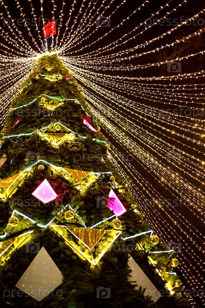 Высокая городская рождественская елка в парке с шапкой из светящихся гирлянд, светится ночью на улице. Рождество, новый год, украшение города. Калуга, Россия