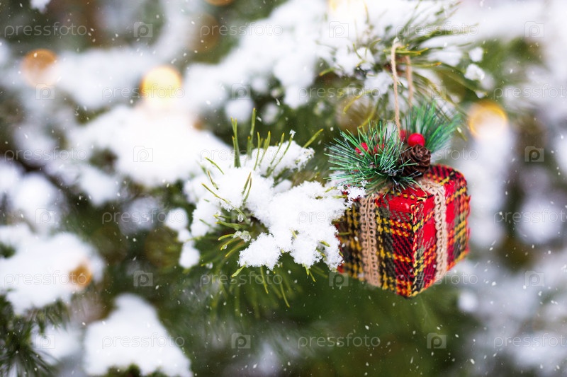Рождественская подарочная коробка на ветке натуральной ели, покрытой снегом. Новый год на открытом воздухе. Снегопад, гирлянды, праздничное настроение сказок и волшебства, убранство улиц. Копировать пространство