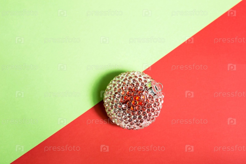 Красный елочный шар с прозрачными ледяными шишками на красно-зеленом фоне с геометрией и тенью. Место для текста. Рождество, Новый год