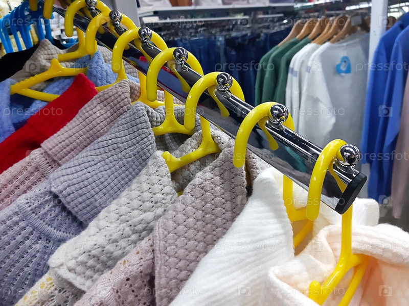 Вешалки в магазине с одеждой висят на окне в ряд. Женская одежда, мода, шоппинг