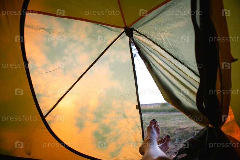 Вид изнутри туристической палатки на солнечный день и природу. Активный кемпинг, экологичность, приключения