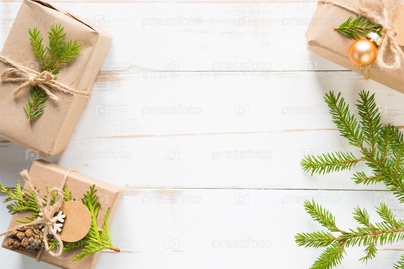 Подарочная коробка к Рождеству и Новому году из экологически чистых материалов: крафт-бумага, живые еловые ветки, шишки, шпагат. Теги с макетом, натуральный декор, ручная работа, сделай сам. Плоско, фон, рамка, Минимализм