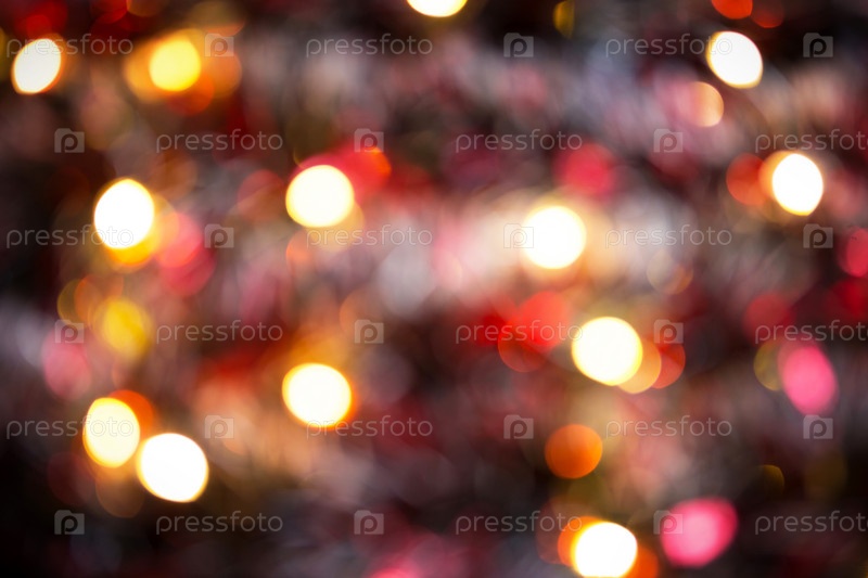 Новогодний фон с размытием Золотые огни гирлянд в боке. Красная мишура, елка. Новый год