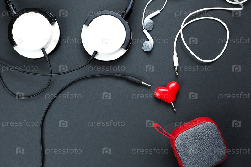 Разветвитель для наушников в форме сердца для влюбленной пары. Подключил к красной портативной колонке и две пары наушников - плоско лежал. День святого Валентина, любовь, современные технологии, пространство для копирования, черный фон