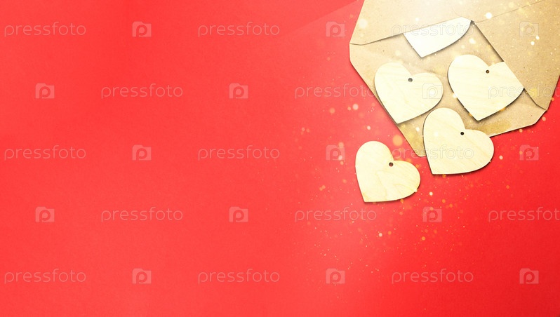 Деревянные сердца высыпаются из открытого конверта на красном фоне. День святого Валентина, любовное письмо, признание в любви, знакомство. Скопируйте пространство, макет