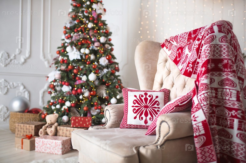 Рождественская елка с красно-белым декором в белой гостиной с подарками в коробках, стул с подушками и одеяло с зимними украшениями, камин, меховой коврик. Новый год в европейском стиле