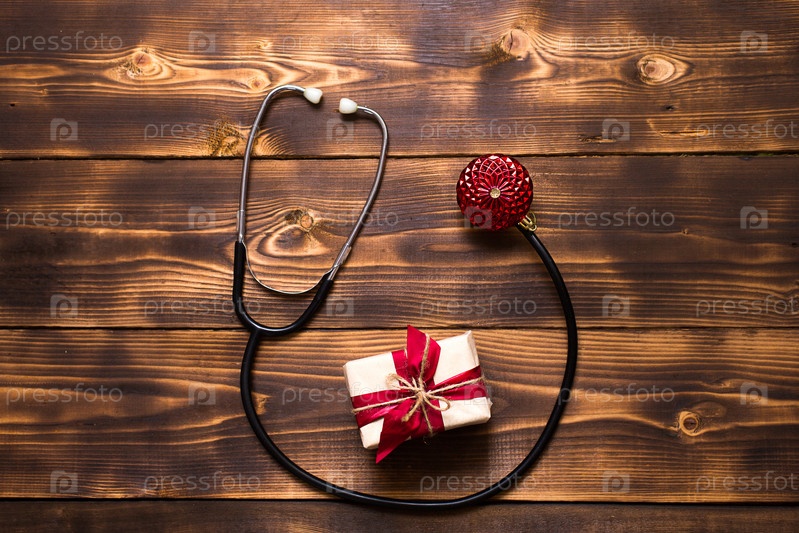 Новогодняя квартира лежала на медицинскую тему. Украшения на новый год из звездочек, шара, ленточек, шапочки Санты и стетоскопа врача. Деревянный фон, место для текста