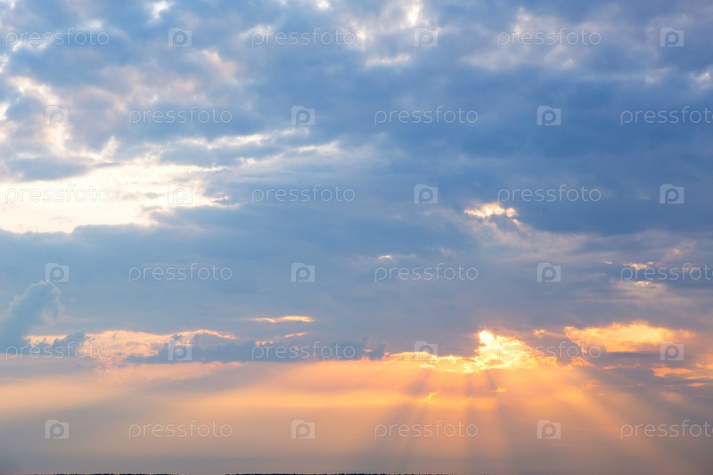 Оранжевые лучи солнца сквозь кучевые облака в небе на закате летом. Небесный волшебный свет