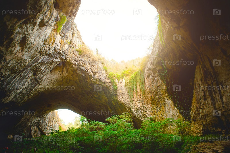 Пещера Деветашка в Болгарии - природная достопримечательность. Высокие своды огромной каменной пещеры с круглыми отверстиями наверху, туристическая дорога с забором внутри пещеры