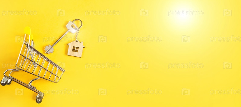 Брелок для ключей в форме деревянного дома с ключом на желтом фоне и корзиной. Ипотека, аренда и покупка недвижимости, весеннее и летнее предложение под строительство. Копировать пространство