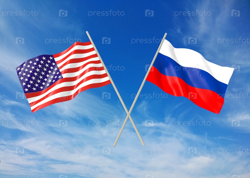 Развязывающиеся флаги России и Америки на фоне красивого неба. 3-D модель