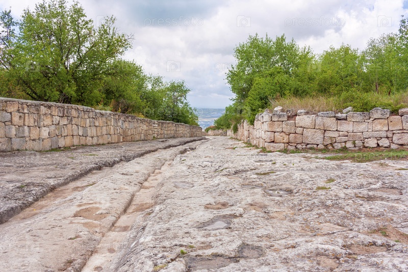 Двор древнего пещерного города Чуфут-Кале, с дорогой с глубокой колеей от колес древних транспортных средств