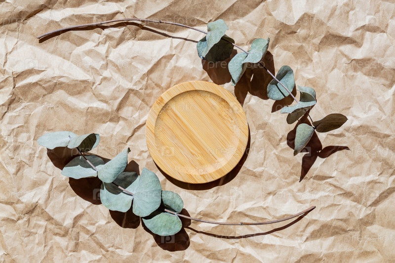 Деревянная тарелка и ветки эвкалипта на фоне бумаги. Макет шаблона для презентации продукта. Эко-стиль и концепция нулевых отходов