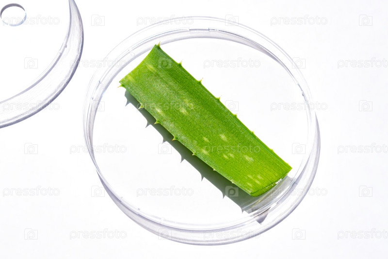 Исследование экстракта алоэ вера в лаборатории с чашкой Петри на белом фоне для исследования косметики алоэ вера, научное содержание фотографии
