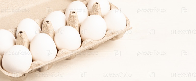 Куриные яйца в картонной коробке на белом деревянном фоне