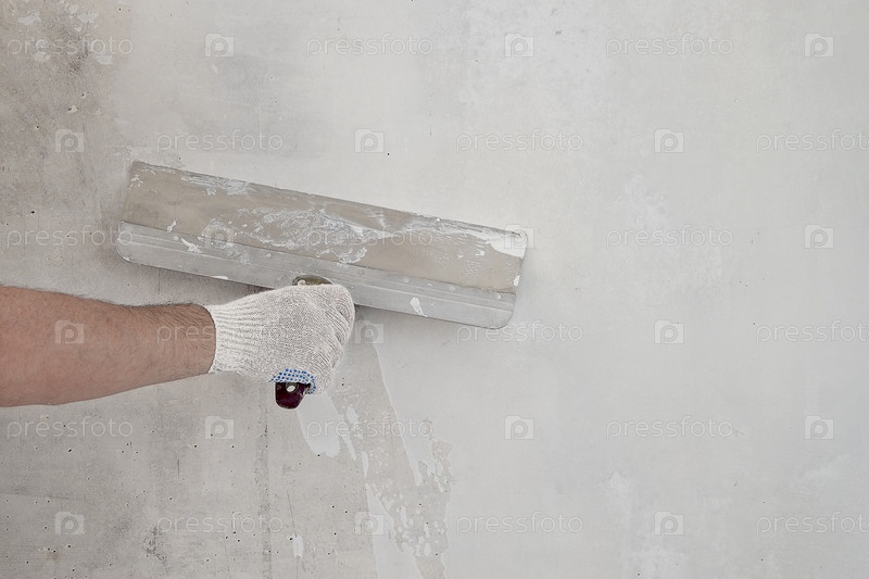 Рука мужчины-мастера в перчатке держит строительную лопатку