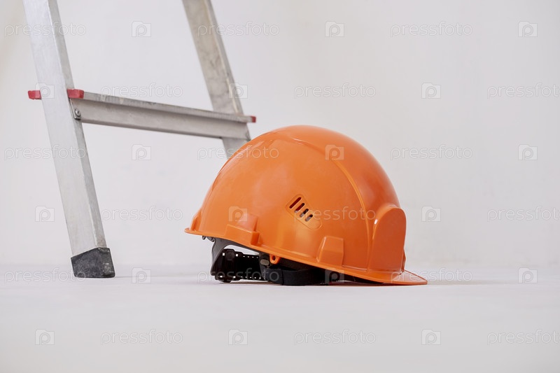 Строительная каска лежит рядом со стремянкой у гипсовой стены