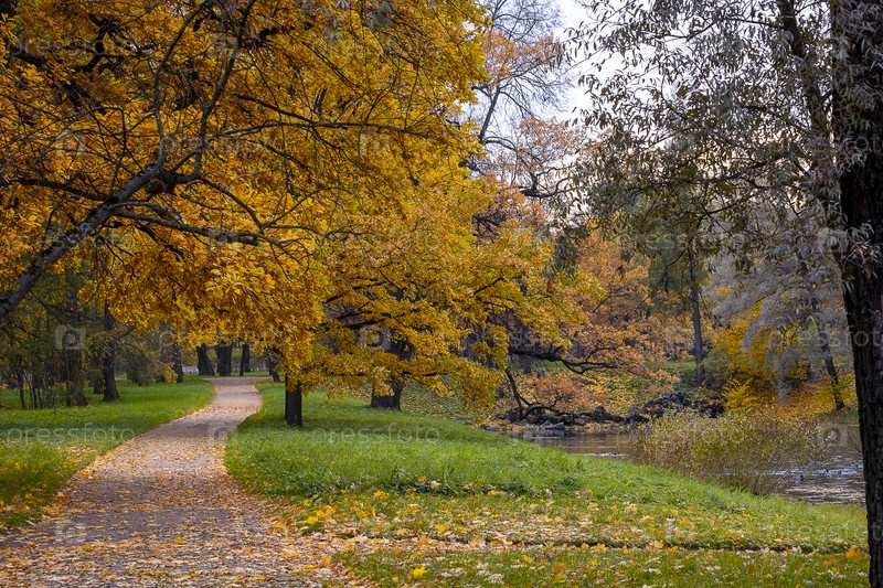 Вид на пустой переулок в парке прекрасным осенним вечером
