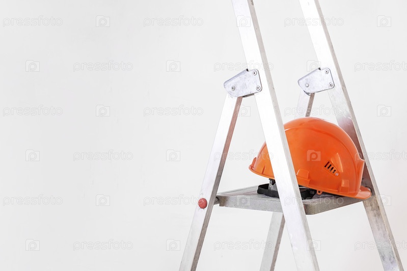 Оранжевая строительная каска для защиты находится на верхней ступеньке лестницы