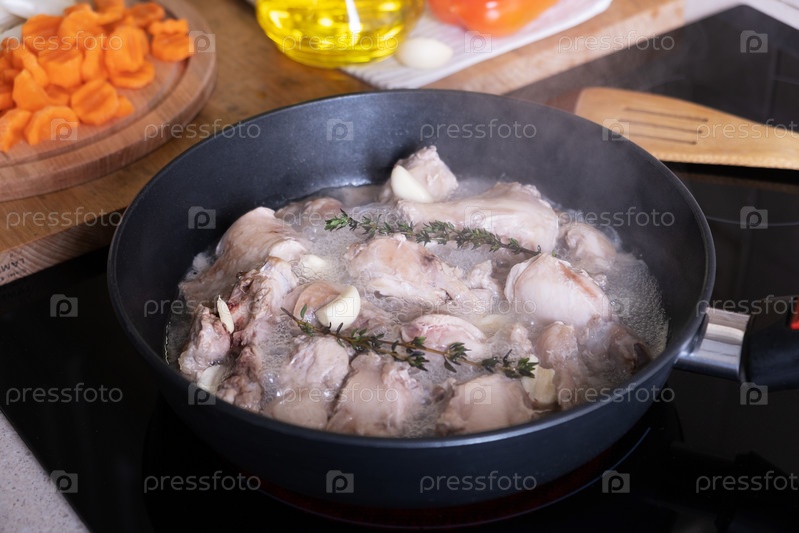 Кусочки нарезанной крольчатины тушат на домашней плите в антипригарной сковороде