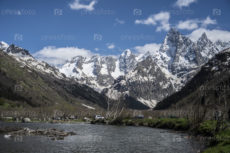 Озеро Туманлы-Кель и горы Северного Кавказа в России. Ясный солнечный день 27 мая 2022 года