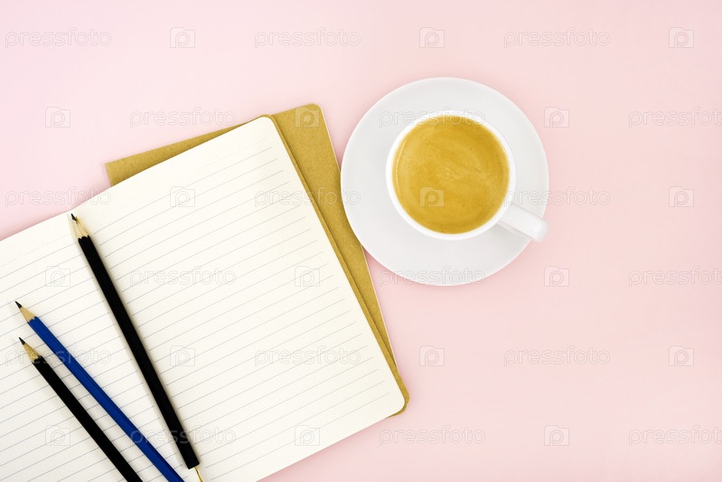 Два блокнота, карандаши и белая фарфоровая чашка с кофе