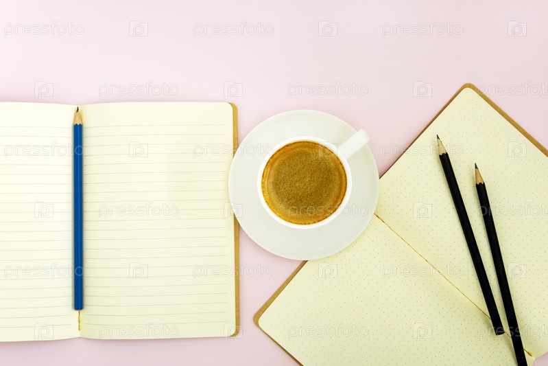 Два блокнота с чистыми листами, карандаши и чашка ароматного кофе