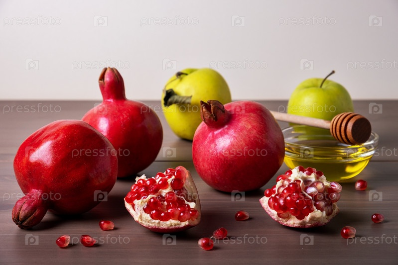 Поздравления с Рош ха-Шана, традиционные гранаты, зеленые яблоки и мед. Еврейский Новый год. Поздравляем. Выборочный фокус