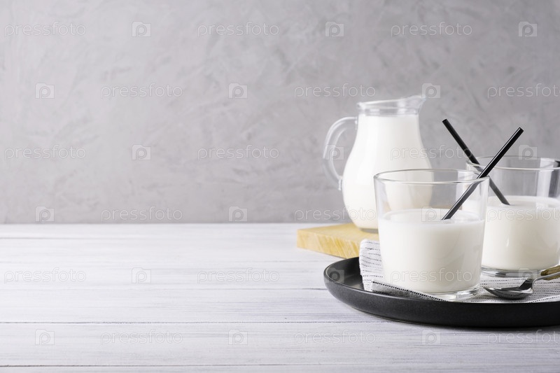 Стеклянные сервировочные сосуды с молоком. Здоровое и диетическое питание, молочные продукты