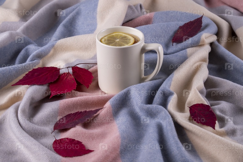 Теплый шарф пастельных тонов, сухие осенние листья и керамическая кружка с горячим чаем