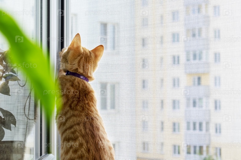 Крупный план милого рыжего полосатого котенка, сидящего на подоконнике с москитной сеткой и ловящего муху