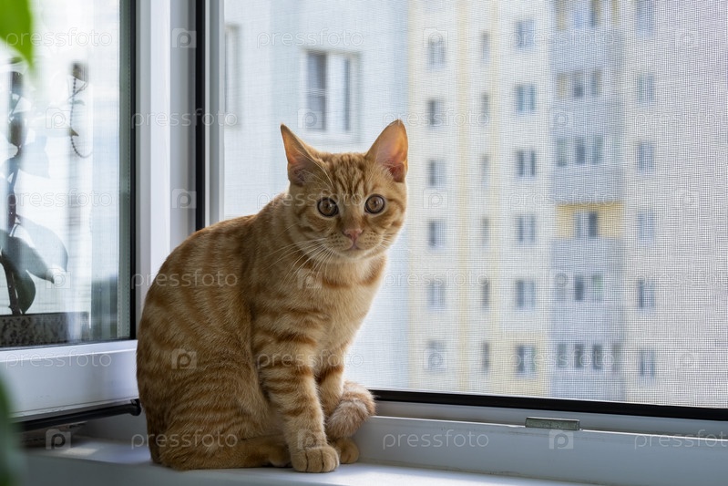Крупный план милого рыжего котенка, сидящего на подоконнике с москитной сеткой