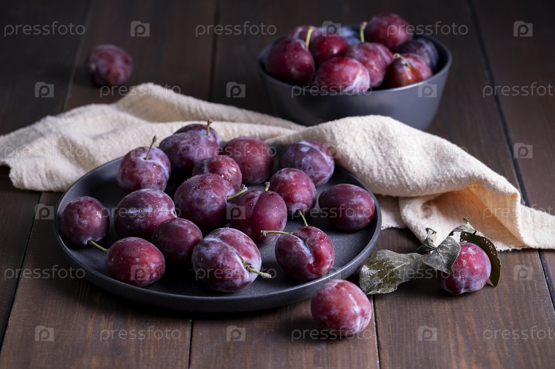 Свежие спелые фиолетовые сливы в блюде на столе из натуральных темных деревянных досок
