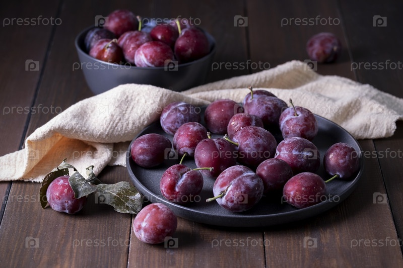 Свежие спелые фиолетовые сливы в блюде на столе из натуральных темных деревянных досок